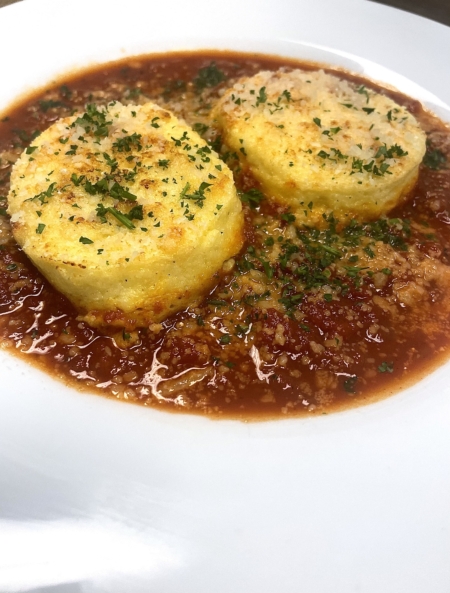 Gnocchi, Roman – Jumbo Semolina dumplings baked in PASTA REA Roasted Tomato Sugo, Grana Padano & Mozzarella, oven ready.