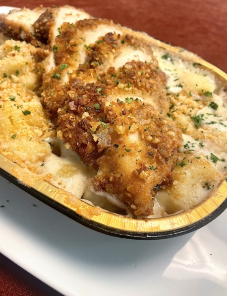 Italian Mac & Cheese with Crispy Chicken Cutlet – Lumache pasta, velvety smooth cream sauce with a variety of Italian cheese and Parmesan, topped with All-natural breast of chicken, lightly pounded, dredged in parmesan focaccia breadcrumbs, pan fried, serves 2.