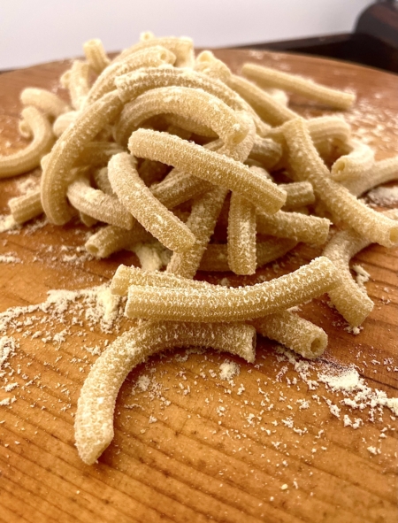 Macaroni-“mak-uh-roh-nee” or maccheroni in Italian. Narrow, ridged tubes. Try it with our Basil Pesto or Marinara.